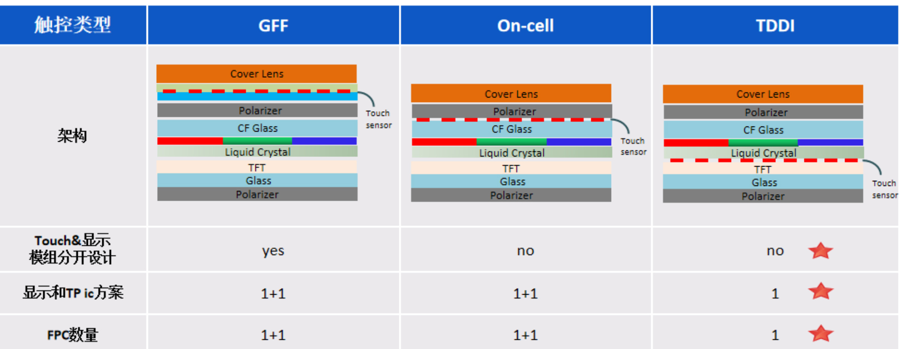 以上,為傳統(tǒng)外掛式GFF/on-cell/TDDI三種方案架構(gòu)對(duì)比: