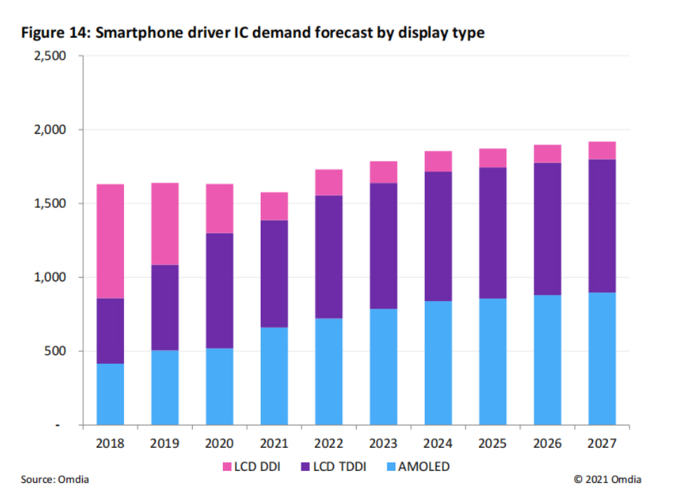 TDDI方案因架構(gòu)的高度集成性,具有顯示屏輕薄化,降低成本,簡(jiǎn)化供應(yīng)鏈等優(yōu)勢(shì),成為了目前手機(jī)LCD屏的主流方案,從2020年LCD TDDI方案在智能手機(jī)顯示觸控應(yīng)用占比已超過(guò)50%。
