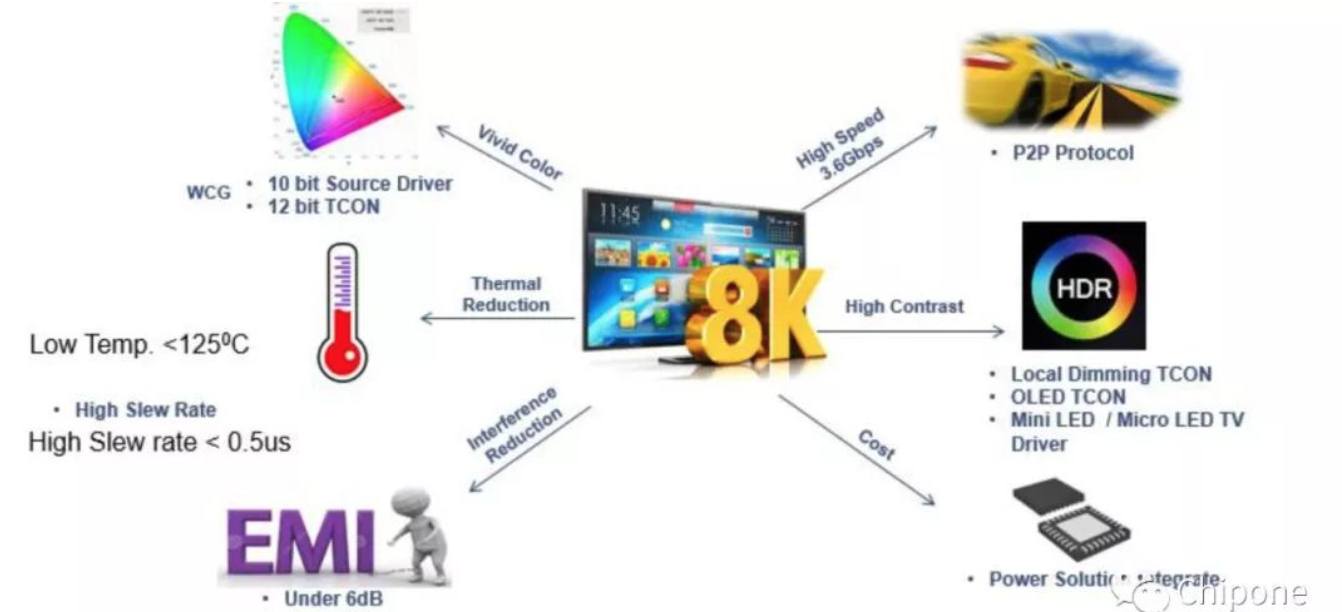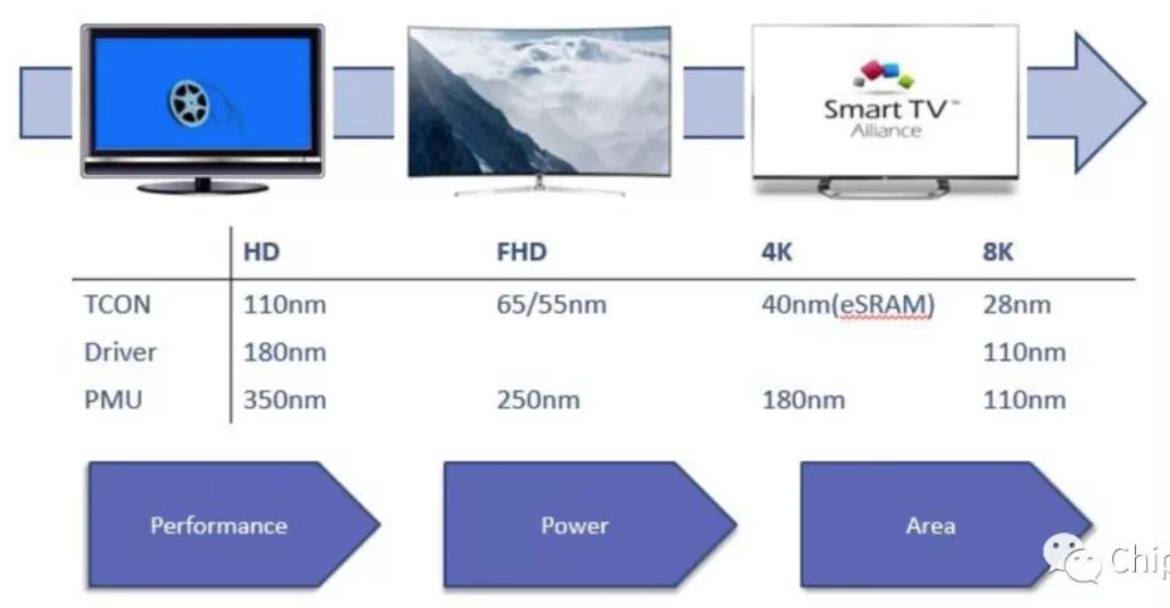 T-con芯片從110nm發(fā)展到8K的28nm,驅(qū)動(dòng)IC從HD的180nm發(fā)展到8K的110nm,電源管理芯片(PMU)從0.35um發(fā)展到8K的110nm。