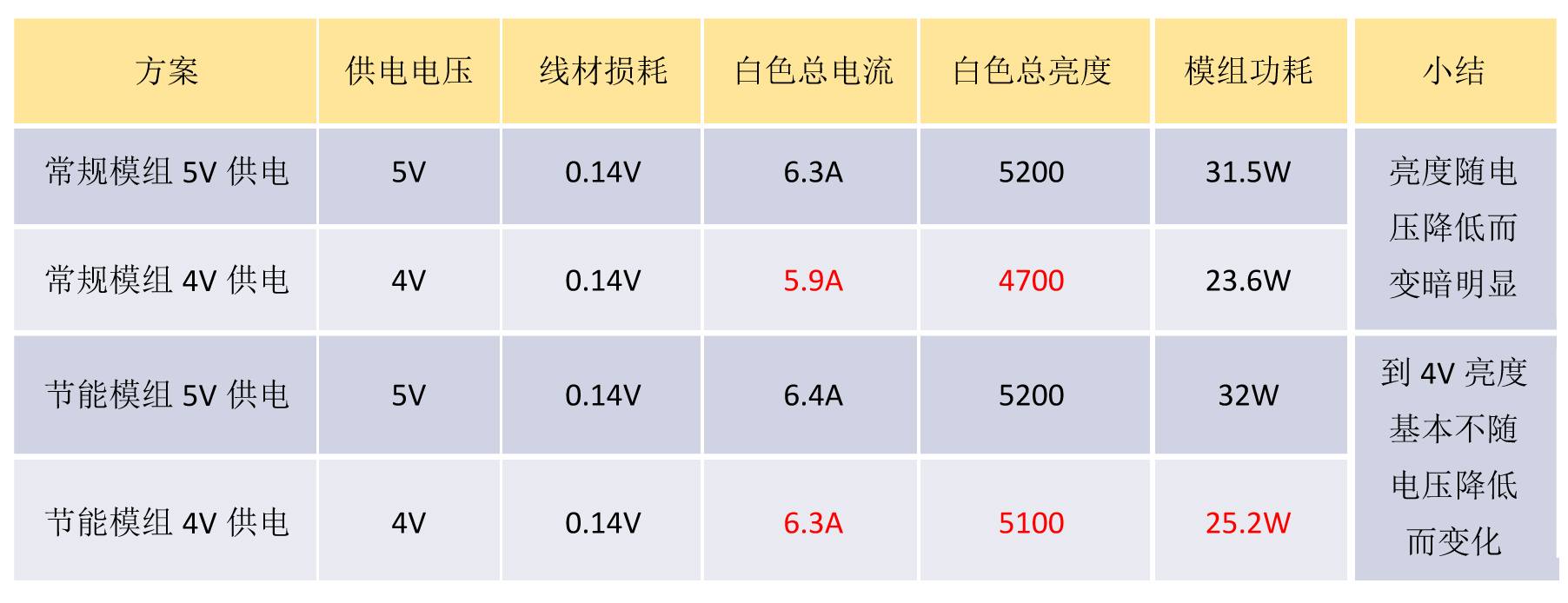 小結(jié):常規(guī)模組在電壓降低的同時(shí),模組電流明顯降低,顏色變紅,說明常規(guī)恒流驅(qū)動(dòng)IC在4V供電時(shí)無法保持恒流輸出。