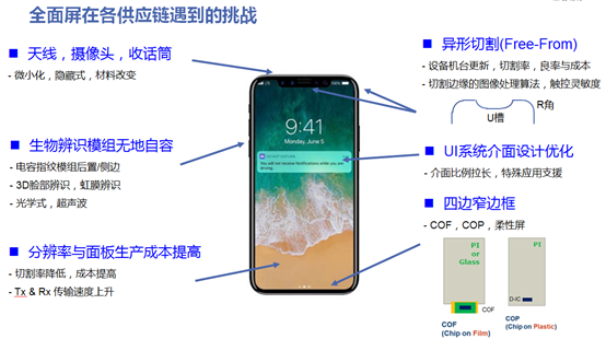 手機產(chǎn)業(yè)鏈正面臨全新的挑戰(zhàn),包括設(shè)計、制造以及工藝上的種種難點。具體問題如:聽筒、前置攝像頭的位置如何重新規(guī)劃,如何解決正面生物識別的問題,如何應(yīng)對面板因切割率降低而產(chǎn)生的成本問題,如何解決異型切割問題……凡此種種,是整個供應(yīng)鏈需要面臨的共同挑戰(zhàn)。