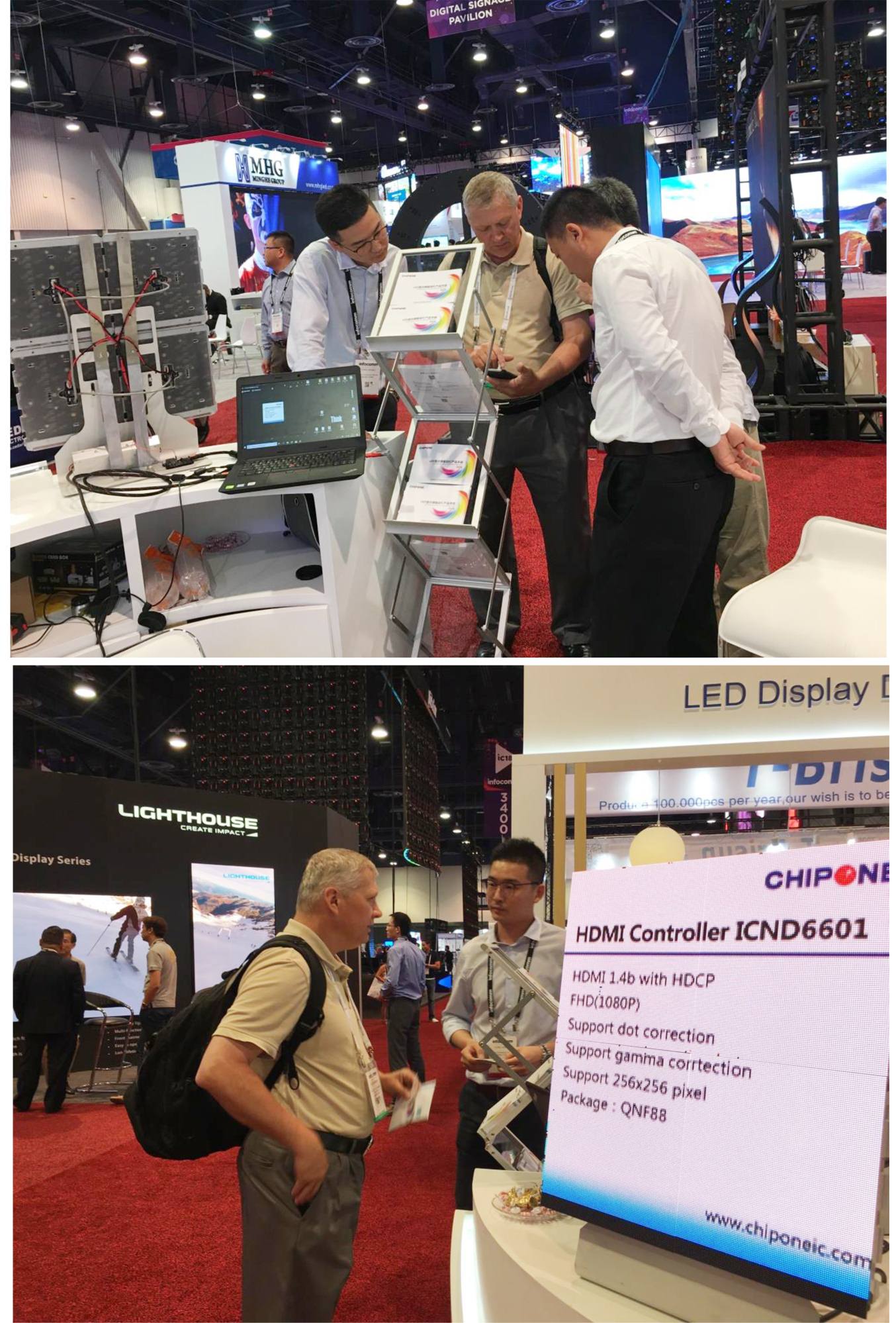 6月6日-8日,為期三天的視聽顯示技術(shù)與系統(tǒng)集成展會(huì)InfoComm在美國(guó)拉斯維加斯會(huì)展中心(LAS VEGAS CONVENTION CENTER)開幕。該展會(huì)由美國(guó)國(guó)際信息交流行業(yè)協(xié)會(huì)舉辦,在專業(yè)視聽、電子系統(tǒng)集成、燈光音響、智能建筑領(lǐng)域享譽(yù)全球,聚集了全球頂級(jí)的視聽技術(shù)、解決方案,為視聽廠商和專業(yè)用戶提供了寶貴的交流平臺(tái)。 集創(chuàng)北方攜多款行業(yè)領(lǐng)先產(chǎn)品首次亮相InfoComm USA展,展示了在LED顯示領(lǐng)域高智能、高集成、高品質(zhì)的創(chuàng)新成果。此次展會(huì)上受到極大關(guān)注的L+產(chǎn)品系列,通過(guò)采用新協(xié)議、新架構(gòu)以及更高的集成度,實(shí)現(xiàn)了雙線串行+行列合一+小封裝體的形式,能夠降低客戶端的綜合成本,通過(guò)智能化的控制以及統(tǒng)一的信號(hào)協(xié)議,進(jìn)一步帶來(lái)設(shè)計(jì)流程上的簡(jiǎn)化。其產(chǎn)品特征主要包括:簡(jiǎn)化電路結(jié)構(gòu)、降低PCB成本;統(tǒng)一信號(hào)協(xié)議,控制簡(jiǎn)便;高集成架構(gòu),更好顯示效果;智能化控制,減少調(diào)試等等。 其中,ICND2200驅(qū)動(dòng)IC是第一次點(diǎn)亮展出,專為超小間距LED顯示屏設(shè)計(jì),具有創(chuàng)新的行列合一整合架構(gòu),雙線串行數(shù)據(jù)傳輸方式,單顆IC控制16x8像素,兩顆級(jí)聯(lián)控制32x16像素。ICND2200以0.95間距及PCB 僅6層的特點(diǎn)吸引了很多客戶駐足拍照,顯示效果較為突出。