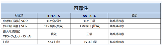 ICN2025實(shí)測結(jié)果為0.5V@20mA,友商沒有給出必要的測試條件,測試結(jié)果存疑。